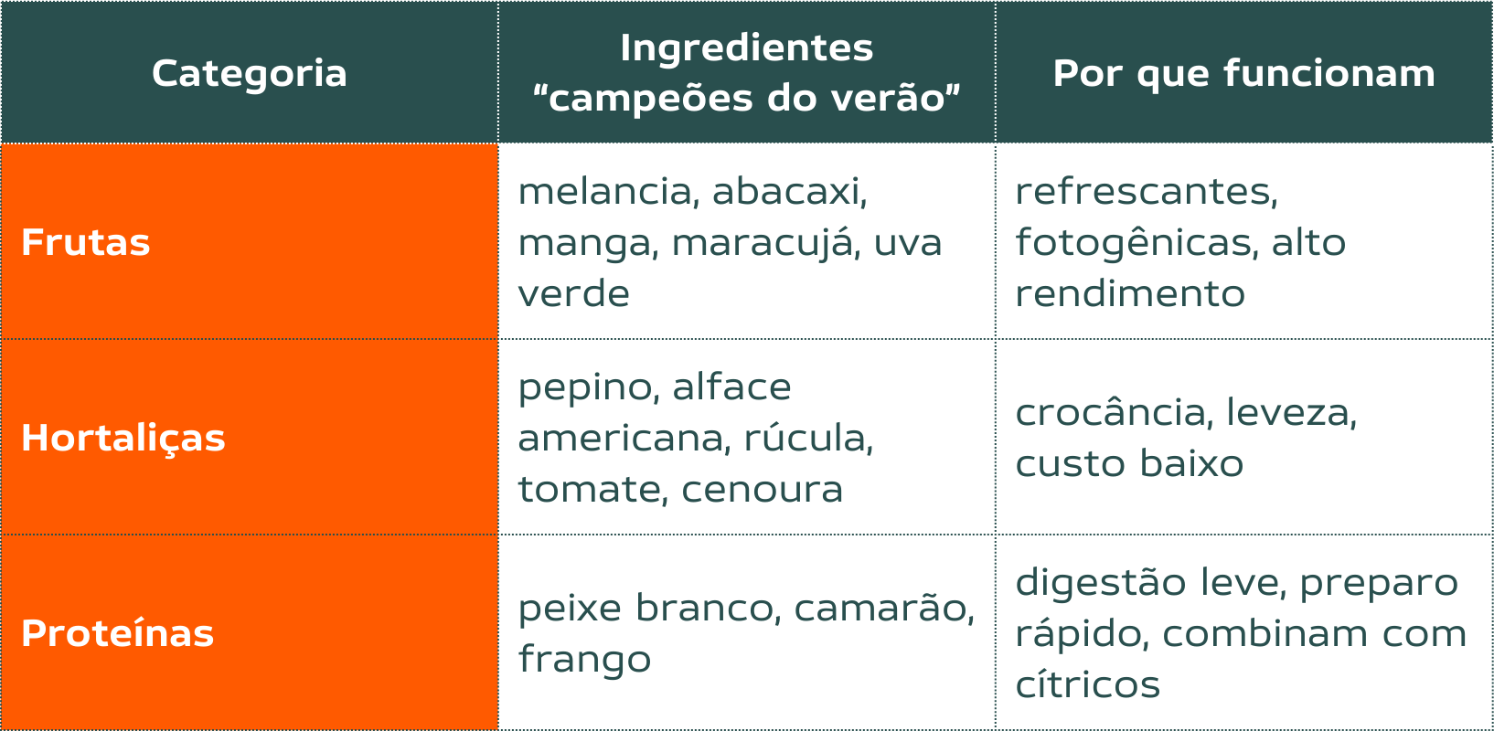 Melancia, abacaxi, manga, tomate, pepino, folhas frescas, pescados, camarão, ervas, limão e bebidas cítricas são campeões. Esses ingredientes têm ótimo custo, alta aceitação no calor e ajudam a criar pratos leves e refrescantes.