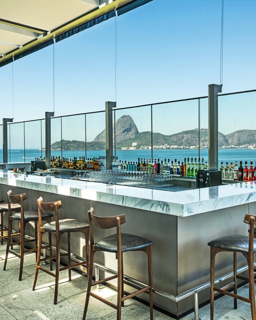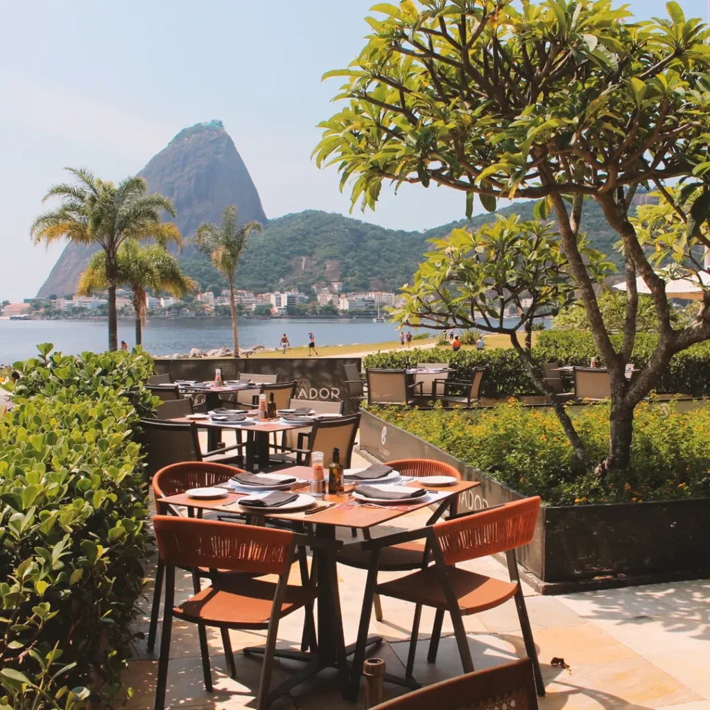 Exemplo: Restaurante Assador, Rio de Janeiro. A vista direta para a Baía de Guanabara e o Pão de Açúcar transforma qualquer mesa em cenário. O salão é amplo, elegante e iluminado naturalmente, o que favorece fotos de pratos, pessoas e paisagens.