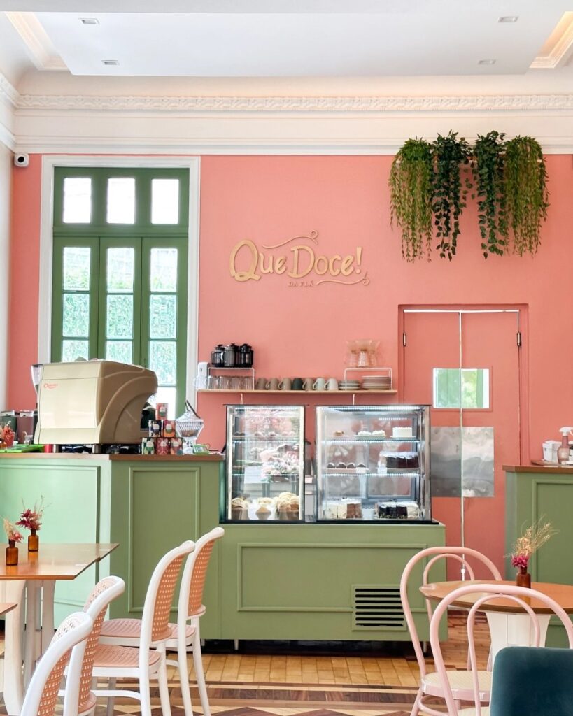 Exemplo: Confeitaria Que Doce!, Rio de Janeiro. Ambiente romântico em tons de rosa, decoração delicada, flores, janelas fotogênicas e diversos cantinhos perfeitos para fotos. É pensado para encantar ao vivo e no feed e isso explica o sucesso em poucos meses.