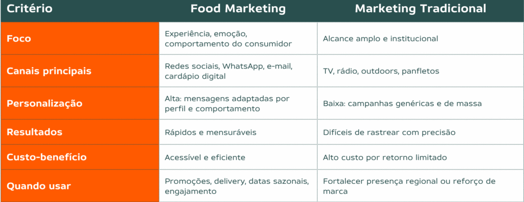 Enquanto o marketing tradicional foca em mensagem e cobertura ampla, o food marketing considera o contexto de consumo, o desejo, o momento, o paladar que envolve comer e adapta canais, linguagem e recursos para o universo de bares e restaurantes.